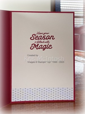I cut out the greeting using the co-ordinating Christmas Labels Die and attached it to the bottom panel of Designer Series Paper using dimensionals. To decorate the inside of the card, I attached a narrow strip of the same Designer Series paper across the bottom of Very Vanilla card. I also stamped another greeting from the Christmas Labels stamp set using Cherry Cobbler card. I love how easy this card was to create using Template Eighteen from the Annual Catalogue and the Ephemera Pack.
