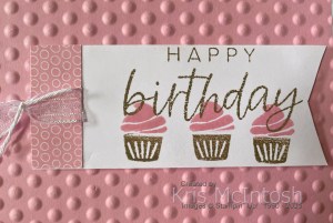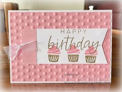 Happy Birthday. This week in my Facebook Live, I share some cards I created using the With You in Mind stamp set which will be available for customers to order in early January. I decided to copy one of the projects shown in the Mini Catalogue to create this card. I embossed a piece of Pretty in Pink card using one of the Basics 3D Embossing Folders (unfortunately this one has already sold out) and attached it to scored and folded Thick Basic White card. I stamped “happy birthday” from the With You in Mind stamp set onto Basic White card using Crumb Cake ink. I inked the cupcake image from the With You in Mind stamp set with Crumb Cake and Pretty in Pink ink and stamped three times across the bottom of the greeting.