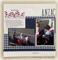 Today’s page celebrates some photos from our Anzac Day celebrations way back in 2010. I cut a piece of Designer Series Paper from the A Little Bit Festive 12″ x 12″ Designer Series Paper using the 1, 2, 3 layout from my first class. This pattern on the opposite side of this paper is very similar so I also cut a piece of Night of Navy 12″ x 12″ card using the same layout. This gave me enough paper to create two double page layouts, one of which I am sharing today. I embossed one 3-1/2″ x 12″ piece and two 1/2″ x 12″ of the Night of Navy card using the Eyelet 3D Embossing Folder. I attached each of the 1/2″ x 12″ embossed strips of card across the bottom of two pieces of Basic White 12″ x 12″ card. I attached a 3-1/2″ x 12″ piece of Designer Series Paper above the Night of Navy card. I cut the 3-1/2″ x 12″ piece of embossed Night of Navy card at 7″ and attached the 7″ piece to the left page and the 5″ piece to the right page above the Designer Series Paper.