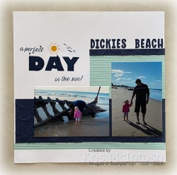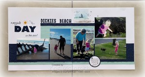 Today’s page shows off some photos from a stay at Dickies Beach Caravan Park with our granddaughter Elyssa. I used Night of Navy card which I embossed using the Plaster Painting 3D Embossing Folder. I can’t remember which Designer Series Paper I used for this one but it goes well with the water theme, I think. I stamped “a perfect” “day” “in the sun” from the Documenting The Day (free with a qualifying order until 28th February) stamp set onto the left hand page using Night of Navy ink. I also stamped the sun image from the same stamp set using Daffodil Delight ink.
