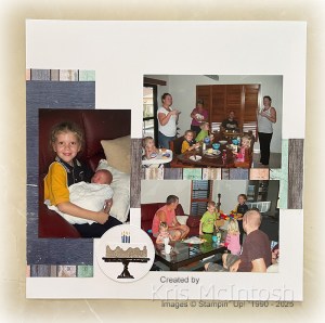 Today’s pages show off some photos from my husband’s birthday way back in 2010. I used a piece of Country Woods 12″ x 12″ Designer Series Paper to create my pages using the 1,2, 3 Layout from this month’s Memory Keeping Class. I attached the Designer Series Paper to Basic White 12″ x 12″ card. I stamped the greeting from the Wildflower Celebrations stamp set onto the left hand page using Misty Moonlight ink to create my title. I stamped the candle image from the Iconic Imagery stamp set onto Basic White card three times using Misty Moonlight ink and cut them out using the co-ordinating Iconic Imagery Die. I cut the “flames” from Daffodil Delight card using an Iconic Imagery Die. I attached the candles beside the title and the “flames” using dimensionals.