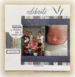 I cut Basic White card using the largest circle from the Stylish Shapes Dies and stamped “you’re the most Awesome” from the Trusty Tools stamp set using Misty Moonlight ink. I used the same ink to stamp “husband”, “dad” and “grand dad” from the Best Family Ever stamp set onto the Basic White circle. I stamped three hearts from the Iconic Imagery stamp set around the greetings using Petal Pink ink. The panel is attached to the left hand page slightly underneath one of the photos. I stamped the outline image from the Wildflower Celebrations stamp set onto the left hand page using Misty Moonlight ink. I stamped the “date” stamp from the Reindeer Memories stamp set inside the outline using Misty Moonlight ink. I hand wrote the date using a Night of Navy Stampin’ Write Marker. I stamped the cake stand image from the Cake Celebrations stamp set onto Basic White card using Early Espresso ink. I stamped the large rectangle “cake” image from the same stamp set onto the cake stand using Crumb Cake ink. I cut the icing image from Basic White card using the Cake Celebrations Die. The candles from the Cake Celebration stamp set are stamped in Misty Moonlight and Daffodil Delight ink.