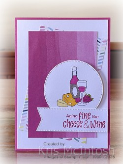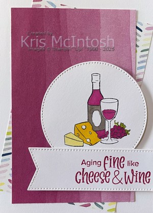 Today’s card once again uses the One More Year stamp set from the January to April Mini Catalogue. For this card I attached two pieces of Bright & Beautiful 6″ x 6″ Designer Series paper to Basic White card. The whole panel is attached to scored and folded Berry Burst card. I stamped the wine & cheese image from the One More Year stamp set onto Basic White card using Memento Tuxedo Black ink.
