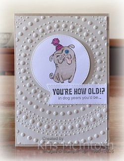 Today’s card once again uses the fun One More Year stamp set. To begin I embossed a piece of Basic Beige card using the Dotted Circles 3D Embossing Folder and attached it to scored and folded Crumb Cake card. I stamped the puppy image from the One More Year stamp set onto Basic White card using Memento Tuxedo Black ink. The image is coloured using Crumb Cake, Dark Petal Pink, Berry Burst and Light Azure Afternoon Stampin’ Blends.
