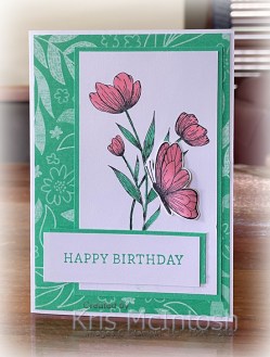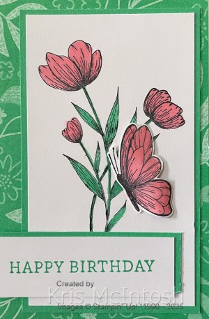 The greeting is attached to Shy Shamrock card and then the card front. I stamped the butterfly from the Spotlight on Nature stamp set onto Basic White card using Memento Tuxedo Black ink. I coloured the image using Petunia Pop and Shy Shamrock Stampin’ Blends.