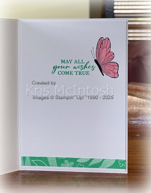 I cut out the image and curled the wings. The butterfly is attached to the card front with dimensionals underneath the wings and Multipurpose glue under the butterfly body. To decorate the inside of the card I stamped the greeting from the Unbounded Love stamp set onto Basic White card using Shy Shamrock ink. I stamped the butterfly from the Spotlight on Nature stamp set beside the greeting using Memento Tuxedo Black ink. I coloured the image using Petal Pink Stampin’ Blends. I also attached a narrow strip of the same In Color Designer Series paper across the bottom of the Basic White card.
