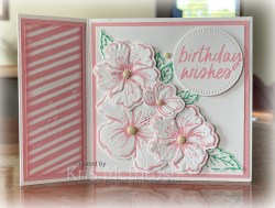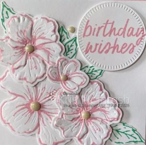 I ran the stamped flowers through the Cut n’ Emboss maching using the Happy Hibiscus Hybrid Embossing Folder, cutting out the flowers at the same time. I stamped the large and small leaf from the Happy Hibiscus stamp set onto Basic White card using Shy Shamrock ink and cut them out using the co-ordinating Happy Hibiscus Die. I attached the flowers to the card front using dimensionals and tucked the leaves underneath the flowers. I stamped “birthday wishes” from the Simply Said stamp set onto Basic White card using Pretty in Pink ink. I cut out the greeting using the circle die from the Happy Hibiscus Dies. I attached the greeting to the card front using dimensionals.