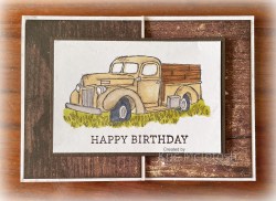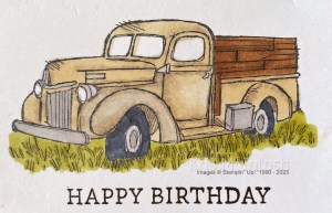 I used the piece I cut from the card base to stamp the truck image from the long retired Country Livin’ stamp set using Memento Tuxedo Black ink. I used Old Olive, Crumb Cake, Pecan Pie, Light Basic Black, Light Smoky Slate, Gray Granite Stampin’ Blends to colour the image. I stamped “happy birthday” from the Simply Said stamp set below the image using Early Espresso ink.