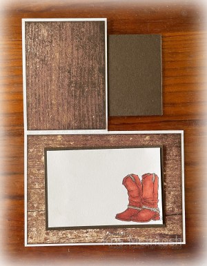 I attached the stamped panel to Early Espresso card and then the card front. I stamped the boot image from the Country Livin’ stamp set onto the lower right hand corner of a piece of Basic White card using Memento Tuxedo Black ink. I coloured the image using Dark Gray Granite and Pecan Pie Stampin’ Blends. The Basic White card is cut to the same size as the front panel. I attached the Basic White card to Early Espresso card and attached it inside the card base so that it is hidden by the stamped panel on the card front. I know that I have used a retired stamp set but I just love how this turned out and it perfectly suits my Grandson.