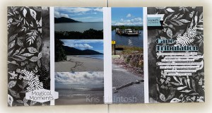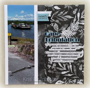 I die cut Basic White and Basic Black card using one of the Beautiful Motifs Dies. I attached the leaves to the left hand page before attaching the greeting over the ends of the leaves. I stamped “never stop exploring” from the retired Let’s Get Away stamp set onto Balmy Blue card using Memento Tuxedo Black ink. I cut out the greeting using one of the banner dies from the Nested Essential Dies. I also cut Basic Black and Basic White card using the same die, although I did extend them slightly. I attached the three banners together before attaching them to the right hand page. I printed the title onto Balmy Blue card and cut it out. I die cut the same leaf from the Beautiful Motifs Dies from Basic White card. I attached “Cape” and then the leaf beside it with the “tribulation” over the ends of the leaf. I printed the journaling onto Basic White card and cut it into strips which I attached below the title.