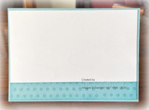 I cut out the image using one of the Spotlight on Nature Dies. I cut Balmy Blue card with another of the Spotlight on Nature Dies and attached them together. I attached the image panel to the card front using dimensionals. To decorate the inside of the card I stamped a narrow strip of Balmy Blue card using the dotted image from the Stripes & Dots stamp set and Balmy Blue ink. I sponged the edges of the stamped panel using Balmy Blue ink before attaching the panel to the bottom of Basic White card. I love how pretty this card looks, don’t you?