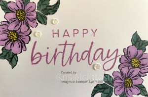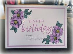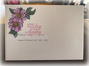 I added three retired Purple Adhesive Backed Sequins around the greeting to add a little bling. To decorate the inside of the card, I stamped the same flower image from the Gallery Blooms stamp set onto the upper left hand corner of Basic White card using Memento Tuxedo Black ink. The image is coloured using the same Stampin’ Blends. I also stamped a greeting from the retired So Sincere stamp set using Fresh Freesia ink. I love how this card turned out I just know that this is going to be a favourite product suite for me.
