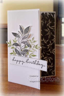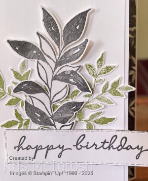 The large leaf is attached using dimensionals. I stamped “happy birthday” from the Arched Wishes stamp set onto Basic White cad using Memento Tuxedo Black ink. I used one of the Textured Notes Dies to cut out the greeting before attaching it to the card front. I did use dimensionals but I made sure that there were none on the piece that overhangs the card front. Janice shared instructions to create the same card using the Arched Wishes stamp set.