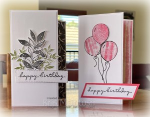 I created mine using Strawberry Slush Paper from the 2025-2027 In Colour 6″ x 6″ Designer Series Paper. The balloons are stamped onto the card front using Memento Tuxedo Black ink. I stamped them again onto the Designer Series Paper using Memento Tuxedo Black ink. I cut out the Designer Series Paper Balloons and attached them to the stamped Balloons. I stamped the greeting from the Arched Wishes stamp set onto Basic White card using Memento Tuxedo Black ink. I trimmed both ends of the greeting on an angle and attached it to Strawberry Slush card which is trimmed to match. I love both of these cards, don’t you? So thank you to Janice for the inspiration even if I did change them a little bit.