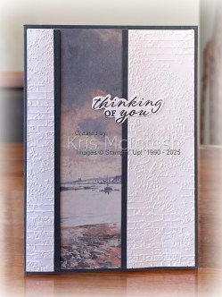 I recently shared some cards I created using the Beautiful Gallery 6″ x 6″ Designer Series Paper and today I have another card to share with you. For this card I attached a strip of Beautiful Gallery Designer Series Paper to Basic White card. I embossed two panels of Basic White card using the Exposed Brick 3D Embossing Folder. I attached a narrow strip of Secret Sea card to one side of each embossed panel before attaching them to the Basic White card using dimensionals. The whole panel is attached to scored and folded Secret Sea card.
