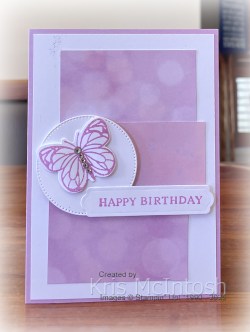 Today I have a card to share using the Beautiful Butterflies stamp set. I attached three pieces of Fresh Freesia patterned paper from the Beautiful Bokeh 6″ x 6″ Designer Series Paper to Basic White card, I did use both sides of the paper. The whole panel is attached to scored and folded Fresh Freesia card. I cut Basic White card using one of the circles from the Stylish Shapes Dies and attached it to the card front using dimensionals. I stamped the butterfly from the Beautiful Butterflies stamp set onto Basic White card using Fresh Freesia ink.
