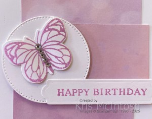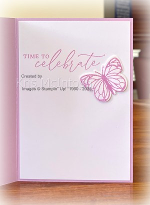 I stamped “happy birthday” from the Beautiful Butterfly stamp set onto Basic White card using Fresh Freesia ink and cut it out using one of the banners from the Beautiful Butterfly Dies. The greeting is attached to the card front using dimensionals where necessary. To decorate the inside of the card I stamped the greeting from the Beautiful Butterflies stamp set onto Basic White card using Fresh Freesia ink. I stamped and die cut another butterfly, the same as the front, and attached it to the inside of the card. Again I did use dimensionals underneath the wings to give it some dimension. A simple card, but pretty, don’t you think?