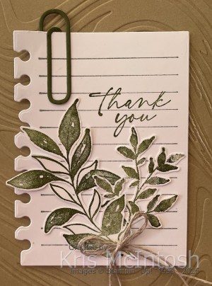 Today I had a little play with the dies from the Just a Note Bundle. I embossed a piece of Crumb Cake two -tone paper using the So Swirly Embossing Folder. The embossed panel is attached to scored and folded Thick Basic White card. I stamped the line image from the Just a Note stamp set onto Basic White card using Smoky Slate ink. I cut out the lines using the Just a Note Die. I stamped “thank you” from the Textured Notes stamp set onto the Basic White panel using Mossy meadow ink.