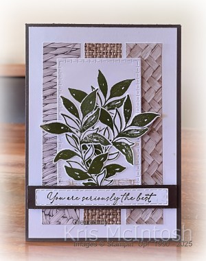 Today I have a card to share with you using the Textured Notes Bundle. I attached three strips of Woven Textures 12″ x 12″ Designer Series Paper to a Basic White panel. I attached the Basic White panel to scored and folded Early Espresso card. I die cut Basic White card using one of the rectangles from the Textured Notes Dies. I stamped the leaf image from the Textured Notes stamp set onto The Basic White die cut using Mossy Meadow ink. I stamped the same leaf image twice onto scrap Basic White card using Mossy Meadow ink and cut them out.