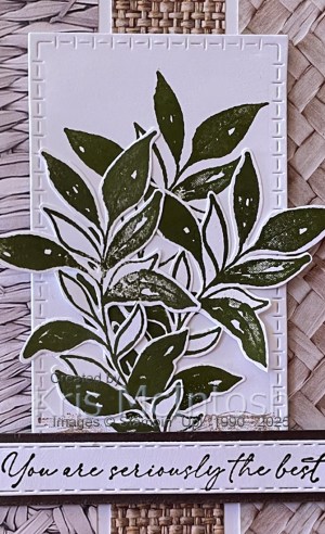 I attached the fussy cut leaves over the stamped leaf, before attaching the panel to the card front using dimensionals. I stamped the greeting from the Textured Notes stamp set onto Basic White card using Early Espresso ink and cut it out using one of the banners from the Textured Notes Dies.
