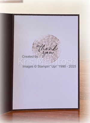 I attached the greeting to a narrow strip of Early Espresso card and then the card front using dimensionals where necessary. To decorate the inside of the card I stamped the woven image from the Textured Notes stamp set onto Basic White card using Crumb Cake ink. I stamped the greeting from the Textured Notes stamp set over the top using Early Espresso ink. This is such a gorgeous bundle, don’t you think.