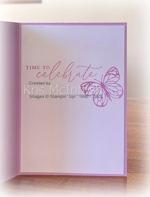 stamped the greeting from the Beautiful Butterflies stamp set onto Basic White card using Fresh Freesia ink. I used one of the banners from the Beautiful Butterfly Dies to cut it out. The greeting is attached across the butterfly using dimensionals. To decorate the inside of the card, I stamped another greeting from the Beautiful Butterflies stamp set using Fresh Freesia ink. I also stamped the smaller butterfly from the Beautiful Butterflies stamp set next to the greeting using Fresh Freesia ink. Simple but pretty. I’d love to know what you think.