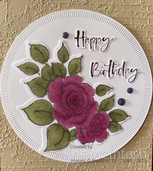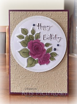 For today’s card, I embossed Crumb Cake card using the Exposed Brick 3D Embossing Folder. The embossed card is attached to scored and folded Blackberry Bliss card. I cut Basic White card using one of the Spotlight on Nature Dies which I attached to the embossed card using dimensionals. I stamped the floral image from the Charming Day stamp set onto Basic White card using Memento Tuxedo Black ink. I coloured the image using Blackberry Bliss and Mossy Meadow Stampin’ Blends. I cut out the image using the co-ordinating Charming Day Die and attached it to the Basic White circle.