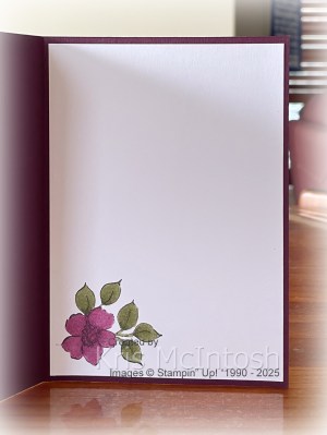 I fussy cut the greeting and attached it to the card front. To decorate the inside of the card, I stamped the smaller floral image from the Charming Day stamp set onto the lower left hand corner of Basic White card using Memento Tuxedo Black ink. I coloured the image using the Blackberry Bliss and Mossy Meadow Stampin’ Blends. The stamped and coloured panel is attached to the inside of the card base. I have had a lot of fun playing with the Charming Day Bundle and the co-ordinating products from the Floral Charm Suite Collection. This bundle is an Online Exclusive, so pop into my store and check it out.