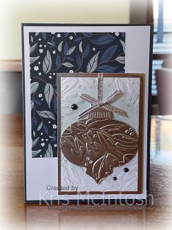 I cut Silver Foil card using the bauble and bauble topper dies from the Ornamental Christmas Dies. The bauble is also embossed using the Traditional Wreath 3D Embossing Folder. I wrapped the top of the embossed Basic White panel with a length of Silver Trim (retired Gold & Silver Trim Combo Pack) and attached the bauble and bauble topper.