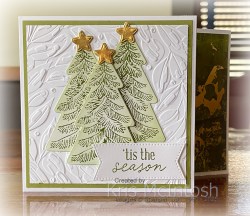 The trees are layered onto the embossed Basic White card with the top tree attached with dimensionals. I die cut Gold Foil card three times using the star from the Pine Tree Trimmings Dies. I attached the stars to the top of each of the tree images. I stamped the greeting from the Pine Tree Trimmings Stamp Set onto Basic White card using Old Olive ink. I cut out the greeting using one of the banners from the Stylish Shapes Dies. I attached the greeting to the card front using dimensionals where necessary. I love these Gift Card Holders for Christmas and I am sure you will see more examples using different product over the next month or so. There is a tutorial for this Gift Card holder in my Free Tutorials.