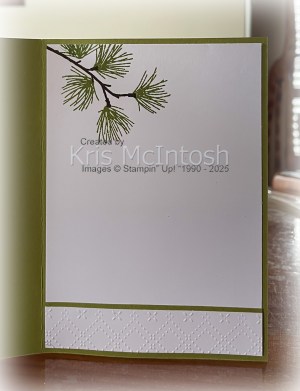 To decorate the inside of the card I stamped the branch and leaves from the Branching Out stamp set into the top left hand corner of Basic White card using Early Espresso and Old Olive ink. I embossed a narrow strip of Basic White card using the Beautiful Pattern Embossing Folder. I attached a narrow strip of Old Olive card behind one long edge of the embossed card and attached it across the bottom of the stamped Basic White card. The whole panel is attached to the inside of the Old Olive card base. If you love the images in this stamp set as much as I do, you need to place your order as this bundle and the stamp set are now on the Clearance Rack.