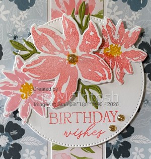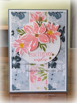 When the 12 Days of Crafting Advent Calender first came out, I just had to purchase it, however, using it took me a little longer! My Mum celebrated her 89th birthday just a few days ago and I couldn’t help but use the gorgeous paper and stamps from the Advent Calender. I added three narrow strips of two designs from the 6″ x 6″ paper to a Basic White panel before attaching it to a Misty Moonlight card base. I cut a circle from Basic White card using the largest circle from the Stylish Shapes Dies. I stamped “birthday wishes” from the 12 Days of Crafting Advent Calender stamp set onto the die cut circle using Flirty Flamingo ink.