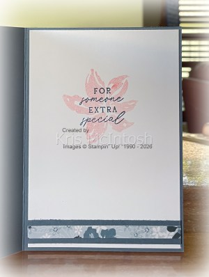 I die cut the leaves from Old Olive card using the die from the Advent Calender and attached them around the flowers. Lastly I added three gold sequins also from the Advent Calender. The image panel is attached to the card front using dimensionals. To decorate the inside of the card I stamped the large flower from the Advent Calender onto Basic White card using Flirty Flamingo ink, making sure to stamp onto scrap paper first. I stamped the greeting from the Advent Calender over the flower using Misty Moonlight ink. I attached a narrow strip of Designer Series Paper to Misty Moonlight card before attaching it across the bottom of the stamped panel. So many amazing things in the Advent Calender, I can’t wait to see if we get another one next year!