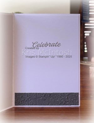 I attached the carriages to the ferris wheel before attaching the image panel to the card front. To decorate the inside of the card I stamped “celebrate” from the Boardwalk Fun stamp set onto Basic White card using Basic Gray ink. I embossed a narrow strip of Basic Gray card using the Stone & Vine 3D Embossing Folder which I attached across the bottom of the stamped Basic White card. Such a fun bundle. I think you will see this one used a lot.