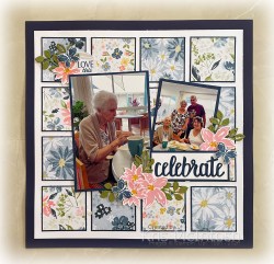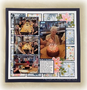 Today’s pages show off some photos from my Mum’s 89th birthday lunch. Everyone was there except Jack who was with his father. I cut the Designer Series Paper from the 12 Days of Crafting Advent Calender into 2-1/4″ squares. I attached each square to a 1-3/8″ square of Night of Navy card before attaching the squares to White Willow 12″ x 12″ card. All of the photos are attached to Night of Navy card before being placed onto the pages.