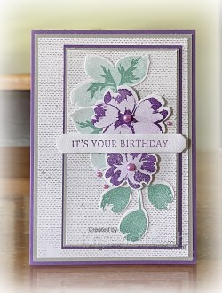 Today I thought I would share the card I made for my eldest daughter for her birthday. I stamped the Lasting Linen background onto Basic White card using Smoky Slate ink. The stamped panel is attached to Smokey Slate card and then scored and folded Gorgeous Grape card. I stamped another panel of Basic White card using the Lasting Linen Background and Smoky Slate ink. This panel is also attached to Smokey Slate card and Gorgeous Grape card before it is attached to the card front. I stamped the large floral outline image from the Petals of Beauty stamp set onto Basic White card using Gorgeous Grape ink.