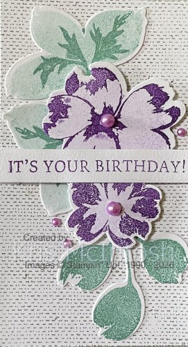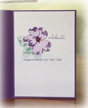The leaf images are cut out using the co-ordinating Petals of Beauty Dies. I layered the die cut images onto the smaller panel stamped with the Lasting Linen Background adding dimensionals underneath the two flowers. I stamped the greeting from the Words of Beauty stamp set onto Basic White card using Gorgeous Grape in and cut it out using one of the banners from the Words of Beauty Dies. The greeting is attached across the floral images using dimensionals where necessary. I coloured two large and three small Basic Pearls (retired) using the Dark Highland Heather Stampin’ Blend. The large pearls are attached to the centre of the flowers and the small pearls around the images. To decorate the inside of the card, I stamped the smaller three leaf image from the Petals of Beauty onto Basic White card using Lost Lagoon ink. The solid image is stamped onto scrap paper first. I created another large flower as I did for the card front and attached it over the stamped leaf. I stamped “celebrate” from the Banner Sayings stamp set beside the flower using Gorgeous Grape ink. I love how pretty this card is, don’t you?