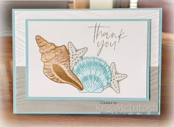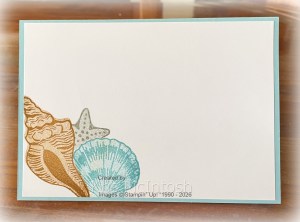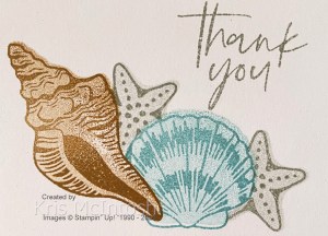 I removed the masks and stamped “thank you” from the Fabulous Sayings stamp set using Smoky Slate ink. The stamped panel is attached to Balmy Blue card and then the card front using dimensionals. To decorate the inside of the card I stamped the large shell, medium shell and star fish images as I did on the front, stamping off for the solid images and covering the large and medium shell with masks. I really love this stamp set and I know that its going to get lots of use.