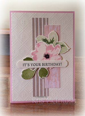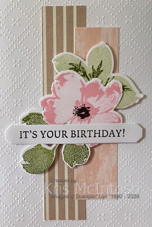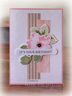 Today I have a couple of cards to share with, both the same design but just slightly different colours. I began by embossing Basic White card using the Beautiful Pattern Embossing Folder. The embossed card is attached to scored and folded Pretty in Pink card. I attached two strips of Brushed with Beauty Designer Series Paper. I stamped the large outline flower from the Petals of Beauty stamp set onto Basic White card using Pretty in Pink ink. I stamped the large solid flower over the top using Pretty in Pink ink which I stamped onto scrap paper first.