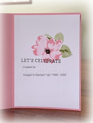 The greeting is attached across the card front using dimensionals where necessary. To decorate the inside of the card I stamped the large floral image from the Petals of Beauty onto Basic White card using Pretty in Pink ink, stamping off the solid image onto scrap paper first.