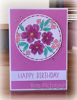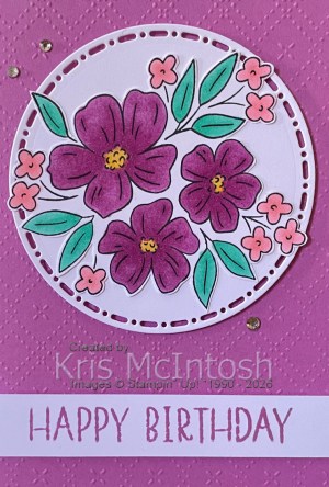 This week in my Facebook Live I shared some cards I created using the 2026 Virtual Card Making Retreat stamp set. This stamp set is only available if you purchase the 2026 Virtual Card Making Retreat. For today’s card I embossed Petunia Pop card using the Beautiful Pattern Embossing Folder. I attached the embossed panel to scored and folded Thick Basic White card. I stamped the large floral image from the Virtual Card Making Retreat stamp set onto Basic White card using Memento Tuxedo Black ink. I coloured the image using Petunia Pop, Summer Splash, Dark Daffodil Delight and Light Pretty in Pink Stampin’ Blends.