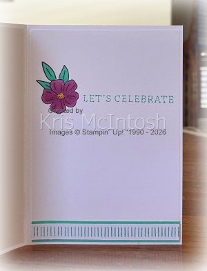 To decorate the inside of the card I stamped “let’s celebrate” from the Simply Said stamp set onto Basic White card using Summer Splash ink. I stamped the small flower from the Card Making Retreat stamp set beside the greeting using Memento Tuxedo Black ink. I coloured the image using Petunia Pop & Dark Daffodil Delight Stampin’ Blends before masking the image and stamping the three leaf image from the same stamp set using Memento Tuxedo Black ink. I removed the mask and coloured the leaves using Summer Splash Stampin’ Blends. I stamped the striped border image from the Card Making Retreat stamp set onto Basic White card using Summer Splash ink. I attached the stamped panel to Summer Splash card before attaching the panel across the bottom of the stamped Basic White card. I have had a lot of fun using this stamp set and absolutely loved attending the Card Making Retreat.