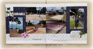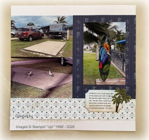 Today I am sharing a page I created using the True Blue Florals Designer Series Paper which was the Product of the Month for January 2026. I cut two strips of the same paper to go across the bottom of each White Willow 12″ x 12″ page and two pieces of the same paper to go on the outside of each page. All of my photos are adhered directly to the page – I didn’t add any card mats. The title is cut from Basic White card using the Mini Alphabet Dies. I used a Blending Brush to add Crumb Cake to the lower part of a piece of Basic White card and another Blending Brush to add Balmy Blue ink to the top of the Basic White card. I inked the palm tree images from the Boardwalk Fun stamp set using Early Espresso and Mossy Meadow ink.