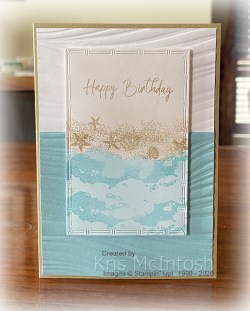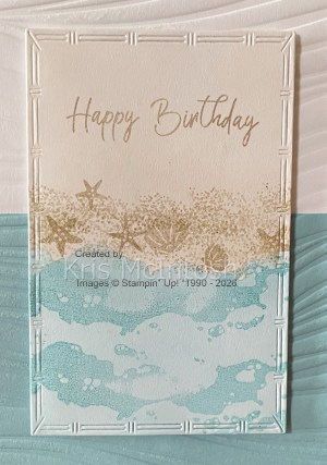 I stamped one of the sea images from the Rolling Waves stamp set three times across the blended Balmy Blue section using Balmy Blue ink. I stamped the dotted image from the Rolling Waves stamp set across the bottom of the Crumb Cake section using Crumb Cake ink. I stamped the three star fish image and the double shell images from the Rolling Waves stamp set onto the dotted images, also using Crumb Cake ink.