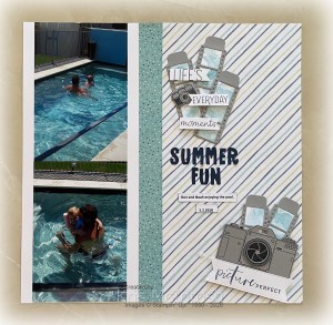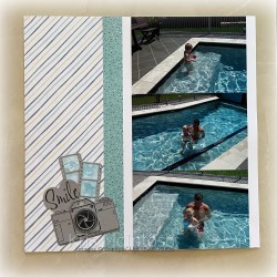 I wanted to scrapbook some photos of my husband with our grandson in the pool from back in 2010. I found the pre made pages in my stash and thought they would work perfectly together. However, I have no idea what Designer Series Paper this is! I need to leave notes with that information with my ready to go pages. After attaching my photos to the page I decided to use the Capturing Smiles Bundle to create some embellishments to add to the pages. I used Smoky Slate card and Memento ink for the stamping.