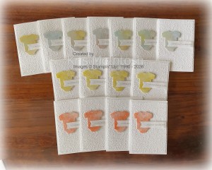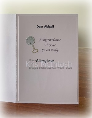 I stamped the heart from the Cutest Onsie stamp set onto each of the onsies using Smoky Slate ink. I attached the onsies to the front of the Note Card using dimensionals. I stamped congratulations from the Cutest Onsie stamp set onto Basic White card 15 times using Smoky Slate ink and cut them out using one of the banners from the Stylish Shapes Dies. I trimmed the right hand edge and attached the greetings to the front of the Note Cards using dimensionals where necessary. I created the journaling for the inside of each of the Note Cards on my computer and attached the die cut rattle beside the greeting. All I have to do now is try and get Mum to sign each one.