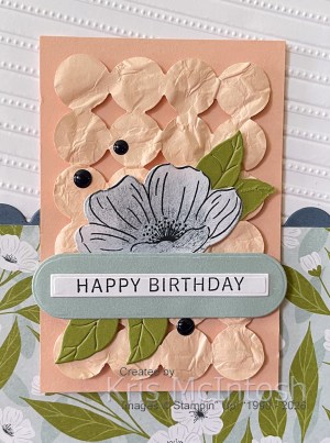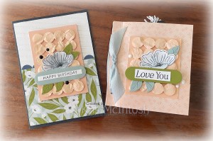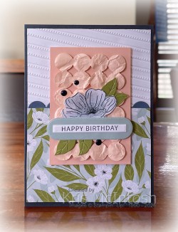 During the online Lovely Blossoms Craft Class that I joined, we created a beautiful mini album which I just adored. I decided to create a card using the front of the album as inspiration. I embossed a panel of Basic White using the Lovely Stripes Embossing Folder. I tilted the paper slightly so that the lines didn’t run straight which is one of the techniques we learned in the class. I cut a line using the circle die from the Lovely Arrangements Dies and attached a piece of Secret Sea card behind the top of one edge of a piece of Lovely Blossoms 12″ x 12″ Designer Series Paper before attaching it to the bottom of the embossed Basic White panel. The whole piece is attached to scored and folded Secret Sea card. I attached a piece of Petal Pink Two-Tone cardstock to the card front, making sure that the dark side with showing.