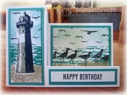 I masked the lighthouse image with a post-it-note and stamped the sea image from the High Tide stamp set over the top using Bermuda Bay ink. To create the sky, I used a sponge to dab Pool Party ink around the lighthouse. Lastly I stamped some of the bird image from the High Tide stamp set around the lighthouse image using Memento Tuxedo Black ink. The image panel is attached to Bermuda Bay card and then the card front. To decorate the right hand back panel, I stamped the sand image from the High Tide stamp set across the bottom of the Whisper White card using Crumb Cake ink.