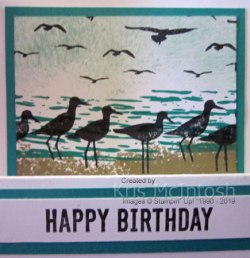 I stamped the sea image from the same stamp set across the middle of the Whisper White card using Bermuda Bay ink. I stamped the seagull image across the panel using Memento Tuxedo Black ink. I used a sponge to dab Pool Party ink across the top of the card to represent the sky before stamping the bird image across the panel. The stamped panel is attached to Bermuda Bay card and then the card front. I stamped “happy birthday” from the Itty Bitty Birthday stamp set onto Whisper White card using Memento Tuxedo Black ink and attached it to Bermuda Bay card before attaching it to the card front.