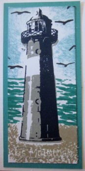 Today’s card is a fancy fold called a Side Step card. This is a relatively simple, but fun fold to create. I cut my card base from Thick Whisper White card. To decorate the long panel on the left, I stamped the lighthouse image from the High Tide stamp set onto Whisper White using Smoky Slate ink with Night of Navy ink over the top. I stamped the sand image from the same stamp set using Crumb Cake ink.